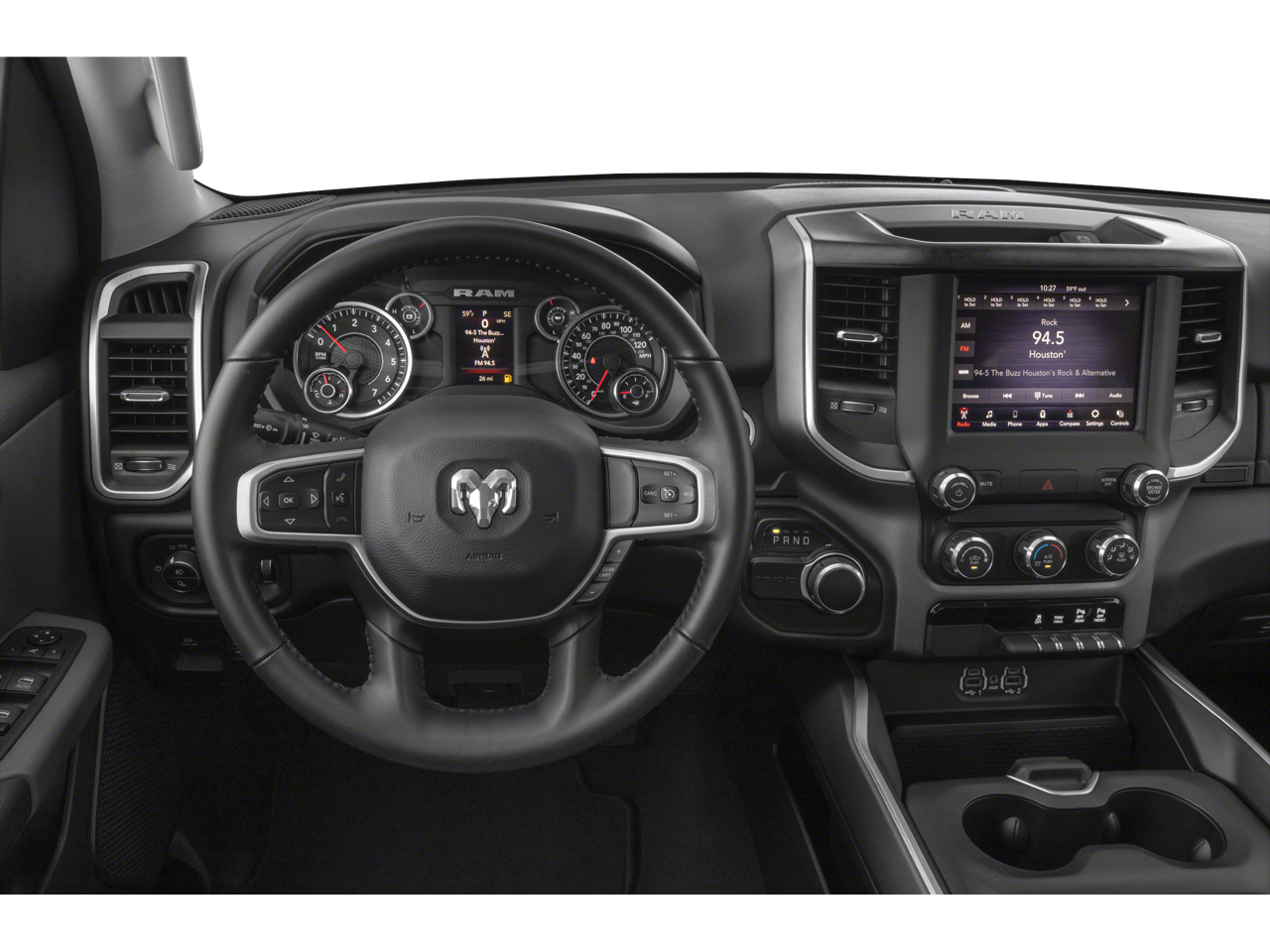 115V Auxiliary Power Outlet, 3 Rear Seat Head Restraints, 33 Gallon Fuel Tank, 4 Way Front Headrests, 4-Wheel Disc Brakes, 40/20/40 Split Bench Seat, 400W Inverter, 48V Belt Starter Generator, 6 Speakers, 9 Amplified Speakers w/Subwoofer, ABS brakes, Air Conditioning, Alloy wheels, AM/FM radio, Anti-Spin Differential Rear Axle, Big Horn Level 2 Equipment Group, Black Exterior Mirrors, Brake assist, Bumpers: chrome, Cloth Bench Seat, Compass, Delay-off headlights, Deluxe Cloth Bucket Seats, Driver door bin, Dual front impact airbags, Dual front side impact airbags, Electronic Stability Control, Front anti-roll bar, Front Center Armrest w/Storage, Front fog lights, Front LED Fog Lamps, Front reading lights, Front Seat Back Map Pockets, Front wheel independent suspension, Fully automatic headlights, GPS Antenna Input, Heated door mirrors, Illuminated entry, Integrated Voice Command w/Bluetooth®, Leather steering wheel, LED Reflector Headlamps, LED Taillamps, Low tire pressure warning, MOPAR Front & Rear Rubber Floor Mats, Night Edition, Occupant sensing airbag, Outside temperature display, Overhead airbag, Overhead console, Panic alarm, ParkSense Front/Rear Park Assist w/Stop, ParkView Rear Back-Up Camera, Passenger door bin, Passenger vanity mirror, Power door mirrors, Power steering, Power windows, Premium Lighting Group, Quick Order Package 27Z Big Horn, Radio data system, Radio: Uconnect 3 w/5 Display, Radio: Uconnect 4 w/8.4 Display, Rear 60/40 Folding Seat, Rear anti-roll bar, Rear seat center armrest, Rear step bumper, Rear Wheelhouse Liners, Remote keyless entry, Remote Start System, Speed control, Split folding rear seat, Steering wheel mounted audio controls, Tachometer, Telescoping steering wheel, Tilt steering wheel, Traction control, Trailer Brake Control, Trip computer, Variably intermittent wipers, Voltmeter, Wheels: 18 x 8 Cast-Aluminum Painted, Wheels: 20 x 9.0 Premium Paint/Polished.