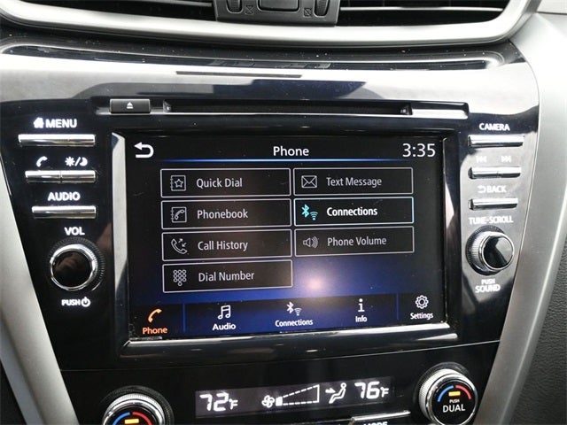 Murano SV, 4D Sport Utility, 3.5L V6 DOHC 24V, CVT with Xtronic, AWD, Pearl White Tricoat, Graphite, 4-Wheel Disc Brakes, 4.667 Axle Ratio, 6 Speakers, ABS brakes, Air Conditioning, Alloy wheels, AM/FM radio: SiriusXM, AM/FM/CD/MP3/WMA Audio System, Auto High-beam Headlights, Auto-dimming Rear-View mirror, Automatic temperature control, Blind Spot Warning, Brake assist, Bumpers: body-color, Carpeted Floor Mats & Carpeted Cargo Mat, CD player, Child-Seat-Sensing Airbag, Delay-off headlights, Driver door bin, Driver vanity mirror, Dual front impact airbags, Dual front side impact airbags, Electronic Stability Control, Four wheel independent suspension, Front anti-roll bar, Front Bucket Seats, Front Center Armrest, Front dual zone A/C, Front fog lights, Front reading lights, Fully automatic headlights, Heated door mirrors, Heated Front Bucket Seats, Heated front seats, Illuminated entry, Knee airbag, Leatherette-Appointed Seat Trim, Low tire pressure warning, NissanConnect featuring Apple CarPlay and Android Auto, Occupant sensing airbag, Outside temperature display, Overhead airbag, Overhead console, Panic alarm, Passenger door bin, Passenger vanity mirror, Power door mirrors, Power driver seat, Power passenger seat, Power steering, Power windows, Radio data system, Rear anti-roll bar, Rear reading lights, Rear seat center armrest, Rear side impact airbag, Rear window defroster, Rear window wiper, Remote keyless entry, Security system, Speed control, Speed-sensing steering, Speed-Sensitive Wipers, Splash Guards & Illuminated Kick Plates, Split folding rear seat, Spoiler, Steering wheel mounted audio controls, Tachometer, Telescoping steering wheel, Tilt steering wheel, Traction control, Trip computer, Turn signal indicator mirrors, Variably intermittent wipers, Wheels: 18 Machined Aluminum-Alloy.