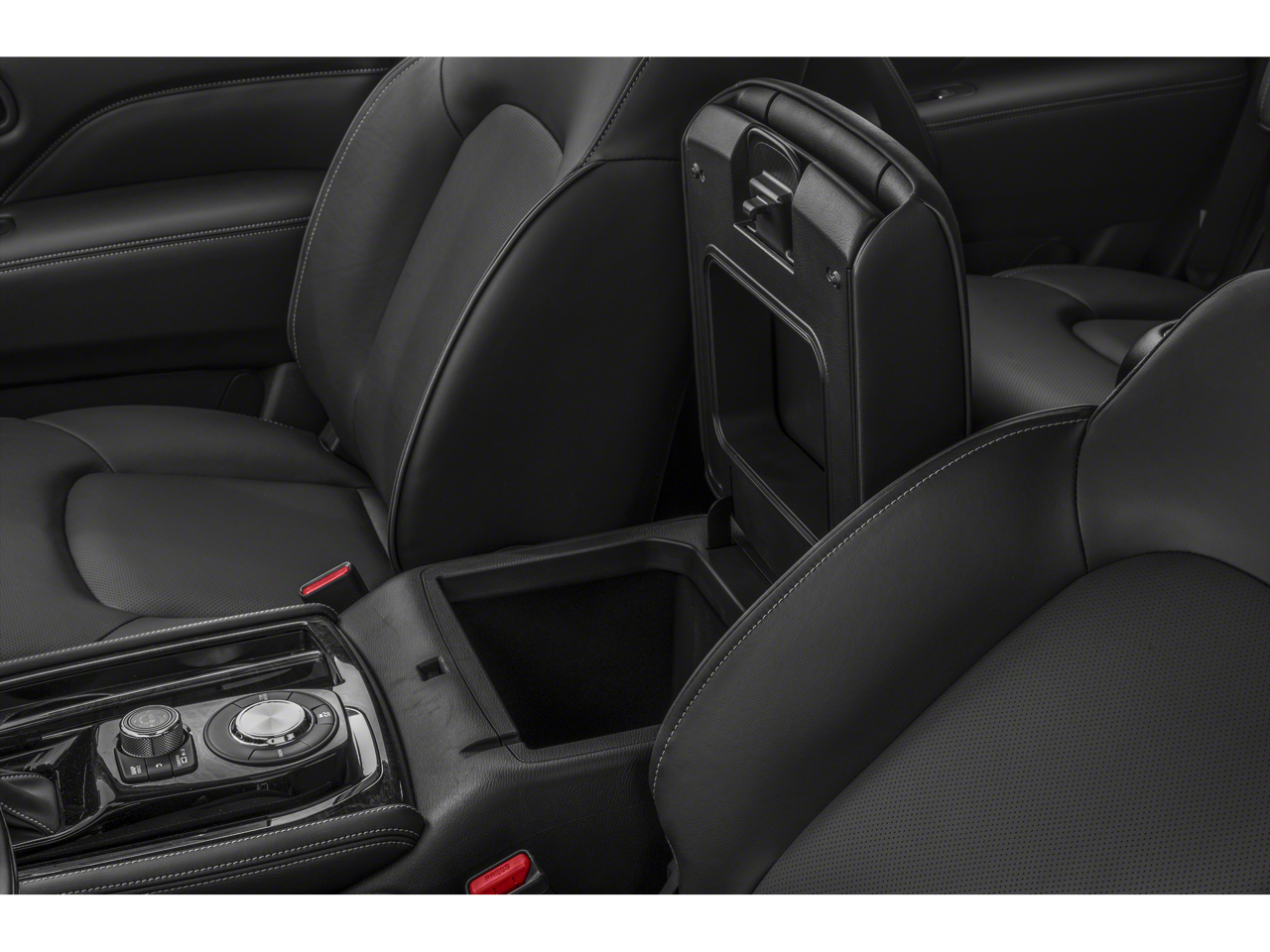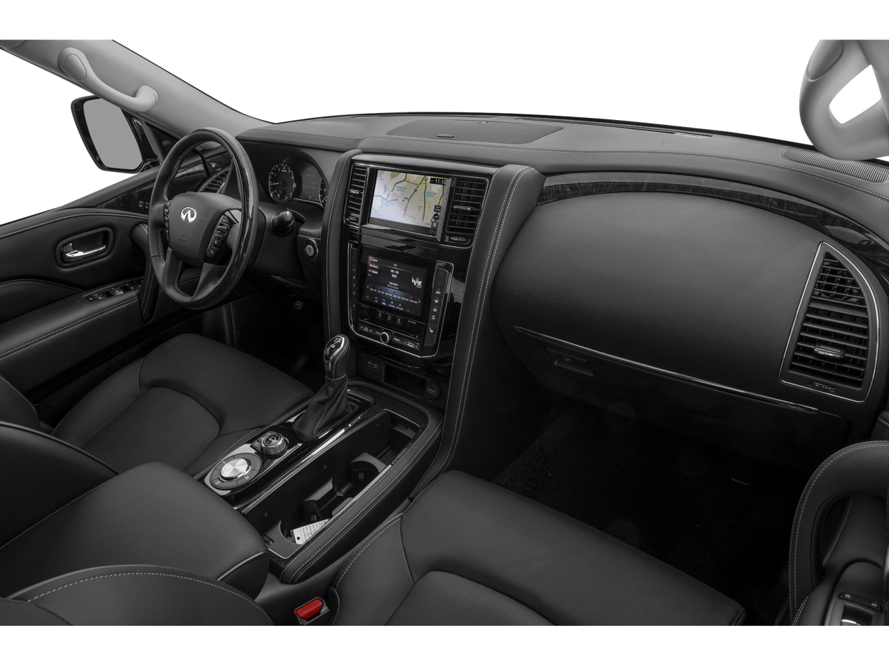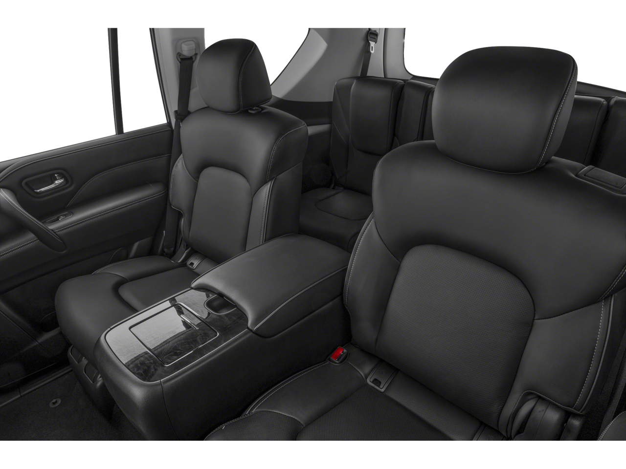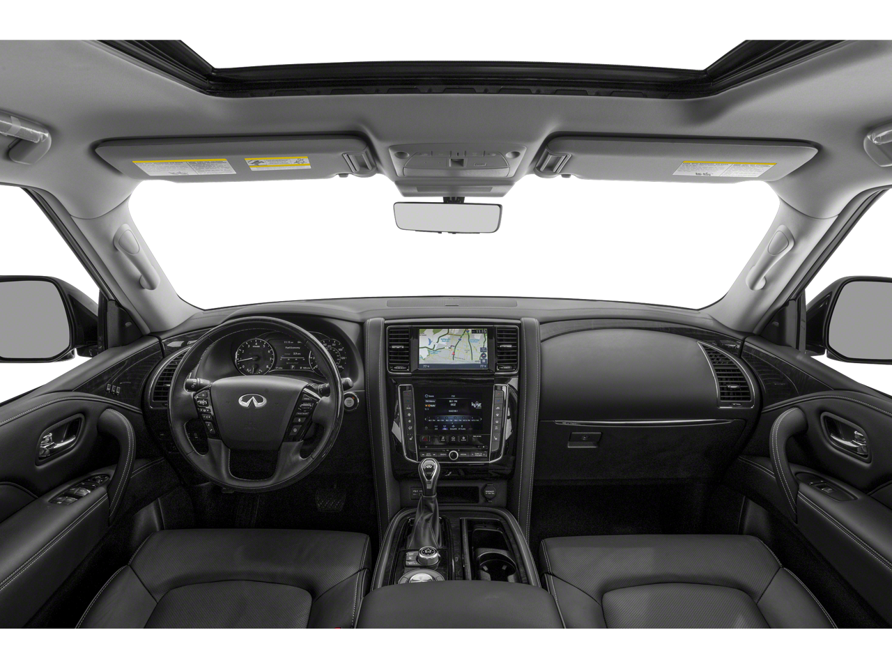 13 Speakers, 2.937 Axle Ratio, 20 Aluminum Alloy Wheels, 3rd row seats: bench, 4-Wheel Disc Brakes, ABS brakes, Air Conditioning, Alloy wheels, AM/FM radio: SiriusXM, Anti-whiplash front head restraints, Apple CarPlay/Android Auto, Auto High-beam Headlights, Auto tilt-away steering wheel, Auto-dimming door mirrors, Auto-dimming Rear-View mirror, Auto-leveling suspension, Automatic temperature control, Brake assist, Bumpers: body-color, Compass, Delay-off headlights, Driver door bin, Driver vanity mirror, Dual front impact airbags, Dual front side impact airbags, Electronic Stability Control, Emergency communication system: INFINITI InTouch, Four wheel independent suspension, Front anti-roll bar, Front Bucket Seats, Front Center Armrest, Front dual zone A/C, Front fog lights, Front reading lights, Fully automatic headlights, Garage door transmitter: HomeLink, Heated door mirrors, Heated Front Bucket Seats, Heated front seats, Heated steering wheel, Illuminated entry, Leather Shift Knob, Leather steering wheel, Leather-Appointed Seats, Literature Kit, Low tire pressure warning, Memory seat, Navigation system: INFINITI InTouch Navigation, Occupant sensing airbag, Outside temperature display, Overhead airbag, Overhead console, Panic alarm, Passenger door bin, Passenger vanity mirror, Power door mirrors, Power driver seat, Power Liftgate, Power moonroof, Power passenger seat, Power steering, Power windows, Radio data system, Radio: Bose Premium Audio System w/13 Speakers, Rain sensing wipers, Rear air conditioning, Rear anti-roll bar, Rear reading lights, Rear seat center armrest, Rear window defroster, Rear window wiper, Reclining 3rd row seat, Remote keyless entry, Security system, Speed control, Speed-sensing steering, Split folding rear seat, Spoiler, Steering wheel memory, Steering wheel mounted audio controls, Tachometer, Telescoping steering wheel, Tilt steering wheel, Traction control, Trip computer, Turn signal indicator mirrors, Variably intermittent wipers, Voltmeter.
