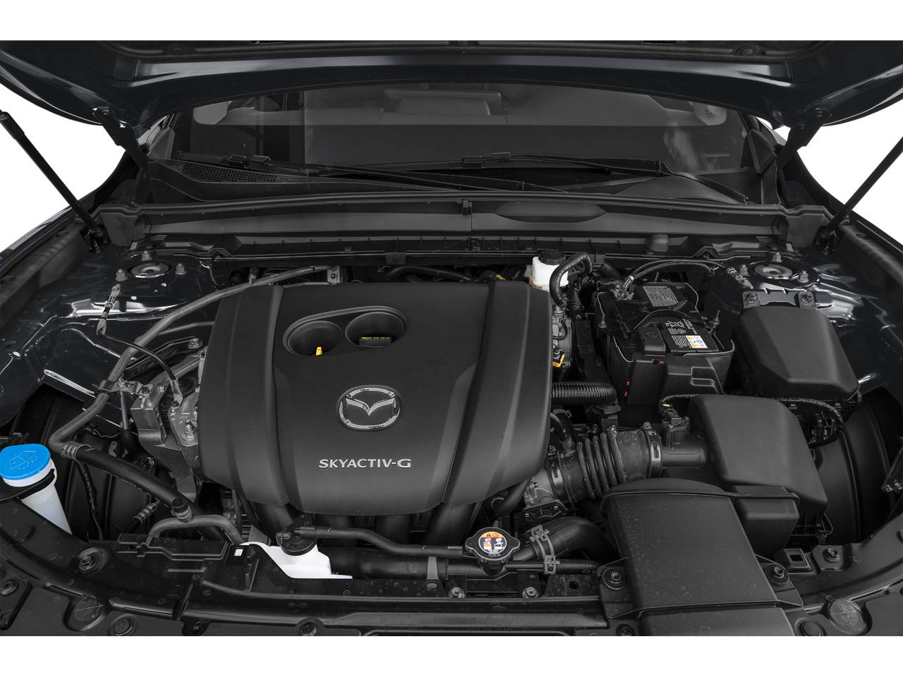 4-Wheel Disc Brakes, 8 Speakers, ABS brakes, Air Conditioning, Alloy wheels, AM/FM radio, AppLink/Apple CarPlay and Android Auto, Auto High-beam Headlights, Automatic temperature control, Brake assist, Bumpers: body-color, Delay-off headlights, Driver door bin, Driver vanity mirror, Dual front impact airbags, Dual front side impact airbags, Electronic Stability Control, Emergency communication system: MAZDA CONNECT, Exterior Parking Camera Rear, Front anti-roll bar, Front Bucket Seats, Front Center Armrest, Front dual zone A/C, Front reading lights, Front wheel independent suspension, Fully automatic headlights, Half Leatherette Seat Trim, Heated door mirrors, Heated Front Bucket Seats, Heated front seats, Illuminated entry, Knee airbag, Leather Shift Knob, Leather steering wheel, Low tire pressure warning, Occupant sensing airbag, Outside temperature display, Overhead airbag, Overhead console, Panic alarm, Passenger door bin, Passenger vanity mirror, Power door mirrors, Power driver seat, Power Liftgate, Power steering, Power windows, Radio data system, Radio: AM/FM/HD 8-Speaker Audio Sound System, Rain sensing wipers, Rear seat center armrest, Rear window defroster, Rear window wiper, Remote keyless entry, Speed control, Speed-sensing steering, Split folding rear seat, Spoiler, Steering wheel mounted audio controls, Tachometer, Telescoping steering wheel, Tilt steering wheel, Traction control, Trip computer, Turn signal indicator mirrors, Variably intermittent wipers, Wheels: 17 x 7J Aluminum Alloy Black Metallic Finish.