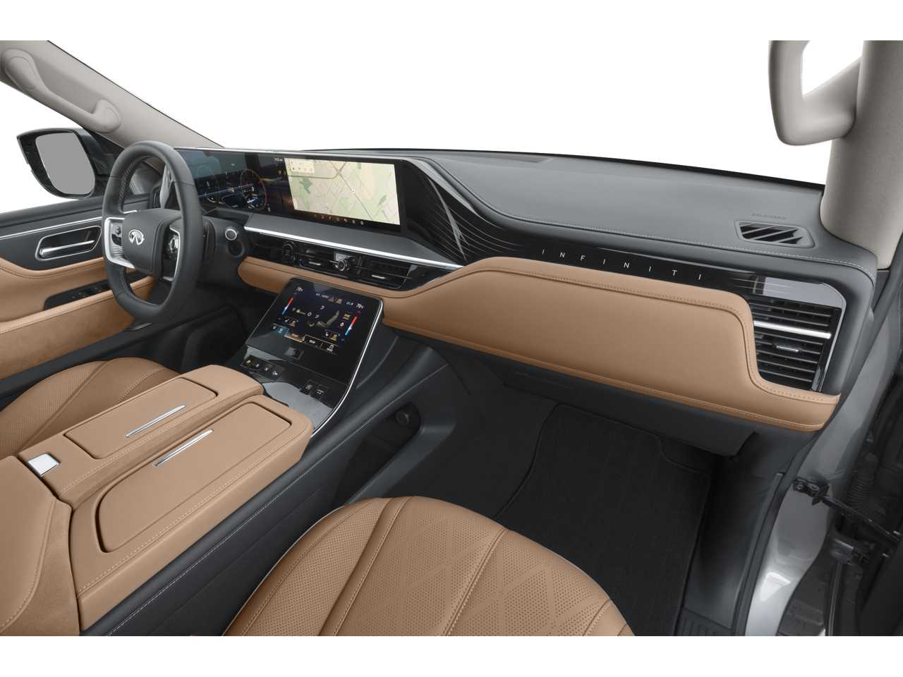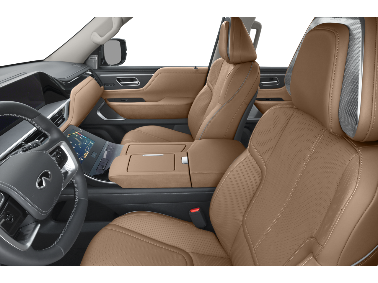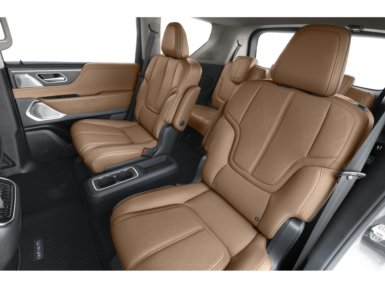 3rd row seats: bench, 4-Wheel Disc Brakes, ABS brakes, Adaptive suspension, Air Conditioning, Alloy wheels, AM/FM radio: SiriusXM with 360L, Anti-whiplash front head restraints, Apple CarPlay/Android Auto, Audio memory, Auto High-beam Headlights, Auto tilt-away steering wheel, Auto-dimming door mirrors, Auto-dimming Rear-View mirror, Auto-leveling suspension, Automatic temperature control, Brake assist, Bumpers: body-color, Center Front Spoiler, Climate Controlled Front Bucket Seats w/Massage, Compass, Delay-off headlights, Driver door bin, Driver vanity mirror, Dual front impact airbags, Dual front side impact airbags, Electronic Stability Control, Emergency communication system: INFINITI InTouch, Four wheel independent suspension, Front anti-roll bar, Front Bucket Seats, Front Center Armrest, Front dual zone A/C, Front reading lights, Fully automatic headlights, Garage door transmitter: myQ Connected Garage, Genuine wood dashboard insert, Genuine wood door panel insert, Heads-Up Display, Heated door mirrors, Heated front seats, Heated rear seats, Heated steering wheel, HVAC memory, Illuminated entry, Knee airbag, Leather steering wheel, Literature Kit, Low tire pressure warning, Memory seat, Navigation system: Google Built-in, Occupant sensing airbag, Outside temperature display, Overhead airbag, Overhead console, Panic alarm, Passenger door bin, Passenger vanity mirror, Power door mirrors, Power driver seat, Power Liftgate, Power moonroof, Power passenger seat, Power steering, Power windows, Premium Paint, Radio data system, Radio: Klipsch Reference Premiere Audio System, Rain sensing wipers, Rear air conditioning, Rear anti-roll bar, Rear reading lights, Rear seat center armrest, Rear window defroster, Rear window wiper, Reclining 3rd row seat, Remote keyless entry, Security system, Semi-Aniline Premium Leather Seating Surfaces, Speed control, Speed-sensing steering, Split folding rear seat, Spoiler, Steering wheel memory, Steering wheel mounted audio controls, Tachometer, Telescoping steering wheel, Tilt steering wheel, Traction control, Trip computer, Turn signal indicator mirrors, Variably intermittent wipers, Ventilated front seats, Ventilated rear seats, Wheels: 22 x 8 Cast Aluminum Alloy.